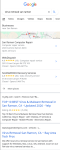 Exemplar: Bay Area Tech Pros’ Virus Removal San Ramon page nets second organic result for Virus Removal San Ramon.